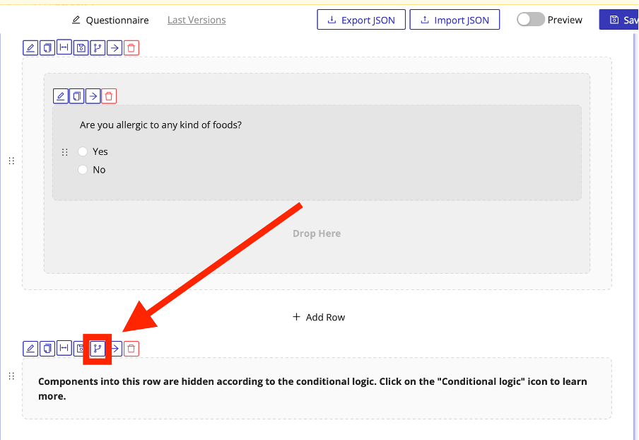 Just above the border of the “Then” or “Input Field” element row, click on the “Conditional Logic” icon.